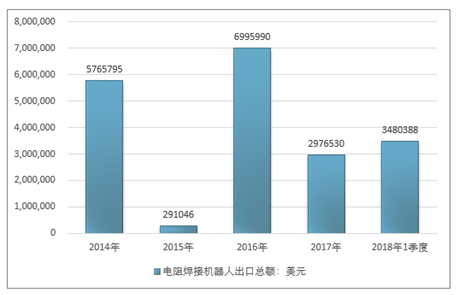 2016年我国电阻焊接机器人出口总额6995990美元,2017年出口总额2976530美元;2019年1季度出口总额3480388美元。