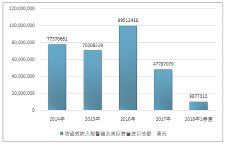2016年我国防盗或防火报警器及类似装置进口总额99512416美元,2017年进口总额47787079美元;2019年1季度进口总额9877313美元。