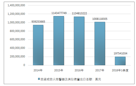 2016年我国防盗或防火报警器及类似装置出口总额1134813222美元,2017年出口总额1008118305美元;2019年1季度出口总额197541034美元。