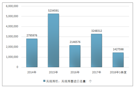2016年我国无线耳机、无线耳塞进口总量2146576个,2017年进口总量3248312个;2019年1季度进口总量1427598个。