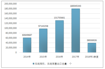 2016年我国无线耳机、无线耳塞出口总量131755661个,2017年出口总量180045343个;2019年1季度出口总量38936926个。