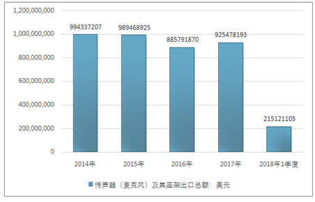 2016年我国传声器(麦克风)及其座架出口总额885791870美元,2017年出口总额925478193美元;2019年1季度出口总额215121105美元。