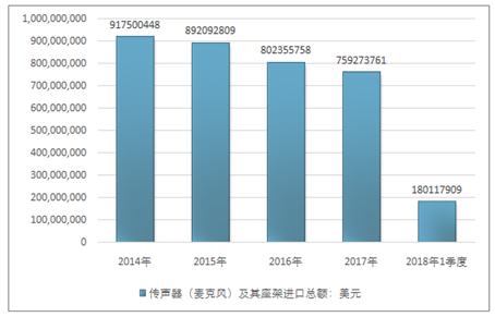 2016年我国传声器(麦克风)及其座架进口总额802355758美元,2017年进口总额759273761美元;2019年1季度进口总额180117909美元。