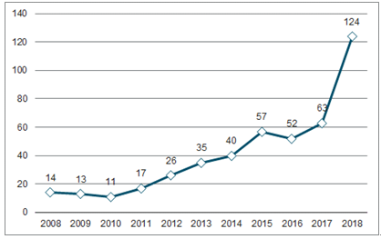 专利公开数量来看,2008年以来,全电动注塑机的专利公开数量同样大幅增长。2019年我国全电动注塑机专利公开数量更是超过100项,达到124项,为历年来的最大值。