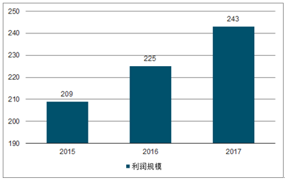2015-2017年中国农业机械制造行业利润规模走势图(亿元)