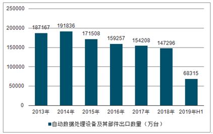 2013-2019H1中国自动数据处理设备及其部件出口数量趋势图