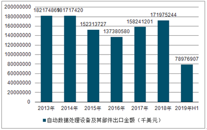 2013-2019H1中国自动数据处理设备及其部件出口金额趋势图
