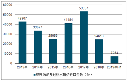 2013-2019H1中国蒸汽锅炉及过热水锅炉进口金额趋势图