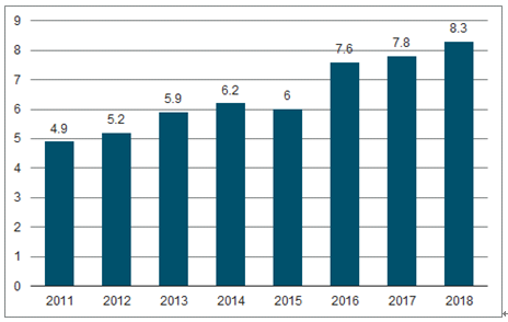 以1000千万的价格水平来看,我国2017年78台电子加速器的产值规模将在7.8亿元左右。2019年全年,辐照加速器行业产值规模达到8.3亿元。