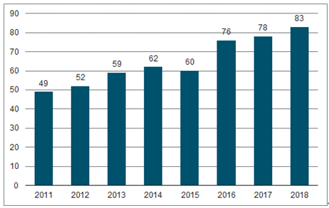 2010年以来在下游需求持续强劲的带动下,我国辐照加速器行业产量从2010年的40余台增长至2017年的78台左右,行业产量保持了平稳增长的态势。2019年全年,我国辐照加速器产量预计达83台。