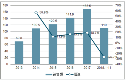 2019年11月净化器线下市场继续走低,受到2017年市场火爆影响,2019年同比下滑幅度加大。2019年1-11月份空气净水器销售额为110亿元,同比下滑26.7%。