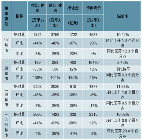 2019年02月300城及各线城市住宅用地供需主要指标概览