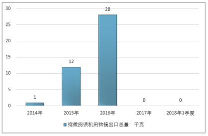 2016年我国缩微阅读机用物镜出口总量28千克 ,2017年出口总量-千克 ;2018年1季度出口总量-千克 。