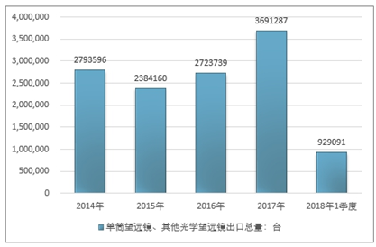 2016年我国单筒望远镜、其他光学望远镜出口总量2723739台 ,2017年出口总量3691287台 ;2018年1季度出口总量929091台 。