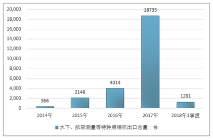 2016年我国水下、航空测量等特种照相机出口总量4014台 ,2017年出口总量18735台 ;2018年1季度出口总量1291台 。