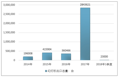 2016年我国幻灯机出口总量360466台 ,2017年出口总量2843621台 ;2018年1季度出口总量23000台 。