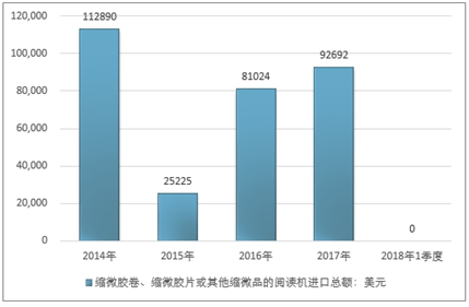 2016年我国缩微胶卷、缩微胶片或其他缩微品的阅读机进口总额81024美元,2017年进口总额92692美元;2018年1季度进口总额-美元。