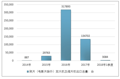 2016年我国照片(电影片除外)放大机及缩片机出口总量317893台 ,2017年出口总量134702台 ;2018年1季度出口总量3084台 。