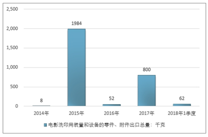 2016年我国电影洗印用装置和设备的零件、附件出口总量52千克 ,2017年出口总量800千克 ;2018年1季度出口总量62千克 。