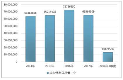 2016年我国放大镜出口总量72756950个 ,2017年出口总量65564309个 ;2018年1季度出口总量13421586个 。