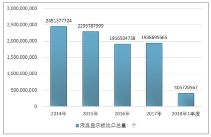 2016年我国液晶显示板出口总量1916504738个 ,2017年出口总量1938695665个 ;2018年1季度出口总量405720567个 。