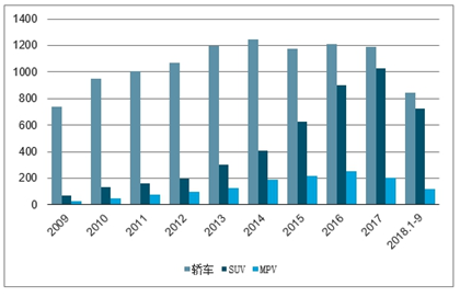 2009-2018年中国汽车细分市场销量对比(单位:万辆)