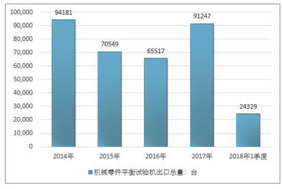 2016年我国机械零件平衡试验机出口总量65517台 ,2017年出口总量91247台 ;2018年1季度出口总量24329台 。