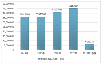 2016年我国试验台出口总额41027621美元,2017年出口总额45152354美元;2018年1季度出口总额6141189美元。