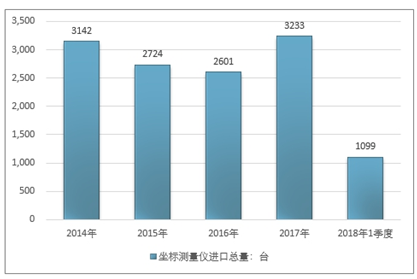 2016年我国坐标测量仪进口总量2601台 ,2017年进口总量3233台 ;2018年1季度进口总量1099台 。