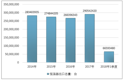 2016年我国恒温器出口总量266396343台 ,2017年出口总量290542420台 ;2018年1季度出口总量66593480台 。