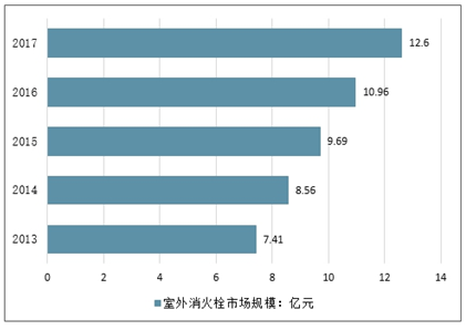 2017年我国室外消火栓市场规模约12.6亿元,同比2016年的10.96亿元增长了14.96%。