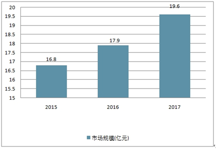 2015年,文物保护修缮市场规模为16.8亿元,2016年,文物保护修缮市场规模达到了17.9亿元,预计2017年,文物保护修缮市场规模将达到19.6亿元。