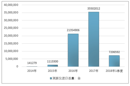 2016年我国测距仪进口总量21354906台 ,2017年进口总量35502012台 ;2018年1季度进口总量7206592台 。