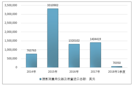 2016年我国摄影测量用仪器及装置进口总额1320102美元,2017年进口总额1404419美元;2018年1季度进口总额70350美元。