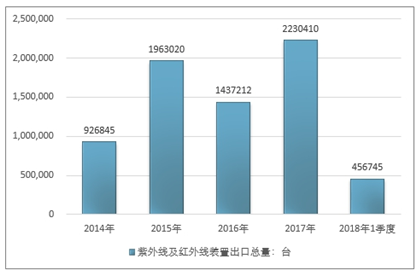 2016年我国紫外线及红外线装置出口总量1437212台 ,2017年出口总量2230410台 ;2018年1季度出口总量456745台 。