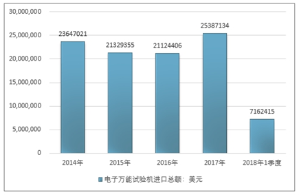 2016年我国电子万能试验机进口总额21124406美元,2017年进口总额25387134美元;2018年1季度进口总额7162415美元。