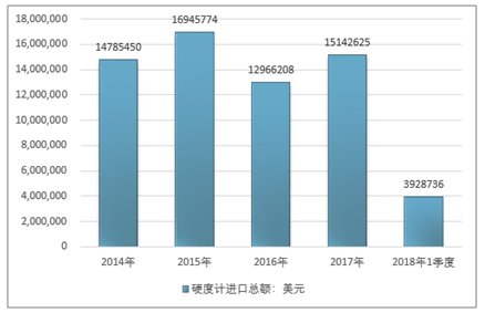 2016年我国硬度计进口总额12966208美元,2017年进口总额15142625美元;2018年1季度进口总额3928736美元。