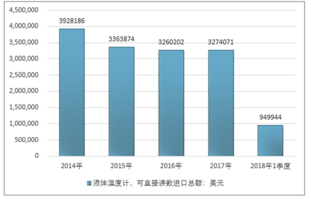 2016年我国液体温度计,可直接读数进口总额3260202美元,2017年进口总额3274071美元;2018年1季度进口总额949944美元。