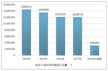 2016年我国压力/差压变送器进口总量12112325个 ,2017年进口总量12038778个 ;2018年1季度进口总量3082861个 。