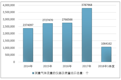 2016年我国测量气体流量的仪器及装置出口总量2766566个 ,2017年出口总量3787968个 ;2018年1季度出口总量1064162个 。