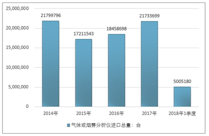 2016年我国气体或烟雾分析仪进口总量18458698台 ,2017年进口总量21733699台 ;2018年1季度进口总量5005180台 。