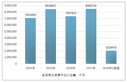 2016年我国表带及其零件出口总量7307829千克 ,2017年出口总量8460724千克 ;2018年1季度出口总量2029435千克 。
