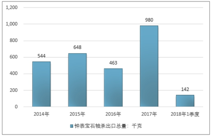 2016年我国钟表宝石轴承出口总量463千克 ,2017年出口总量980千克 ;2018年1季度出口总量142千克 。