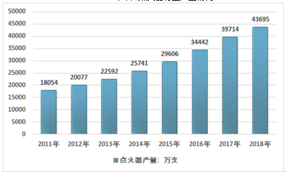 2011年我国点火器行业产量约18054万支,到2018年增长到了43695万支。近几年我国点火器行业产量情况如下图所示: