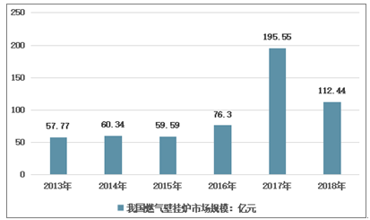 2013年,中国燃气壁挂炉市场规模为57.77亿元,2018年,中国燃气壁挂炉市场规模为112.44亿元,较去年相比,有所下降。