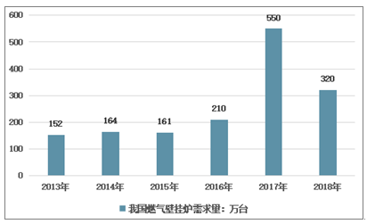 2013年,中国燃气壁挂炉需求量为152万台,2018年,中国燃气壁挂炉需求量为320万台。