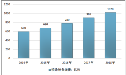 随着经济的发展和全球涂装技术的不断优化,我国通过引进、消化、吸收国外先进技术,使得涂装技术有了质的飞越,促进了涂装市场的发展。2018年我国喷涂设备行业市场规模约1020亿元,同比2017年的905亿元增长了12.71%。