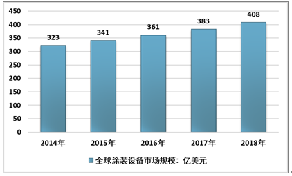 2018年全球涂装设备市场规模突破400亿美元,达到408亿美元,相比2017年的383亿美元,增长了6.53%。