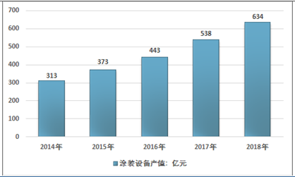 2014年我国涂装设备市场行业产值约313亿元,到2018年的增长到了634亿元,较2017年的538亿元,增长了96亿元,同比增幅达17.84%。