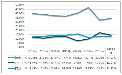 2012-2019年10月我国铁矿石三大产区产量份额统计图